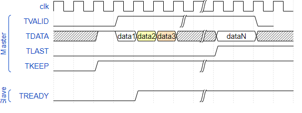 - Le Master envoie les données sur TDATA, avec TLAST à '1' sur la dernière donnée.