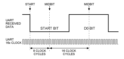 La technique classique est le suréchantillonnage 16x : le diviseur de fréquence génère 16 ticks par période de bit. Le récepteur :